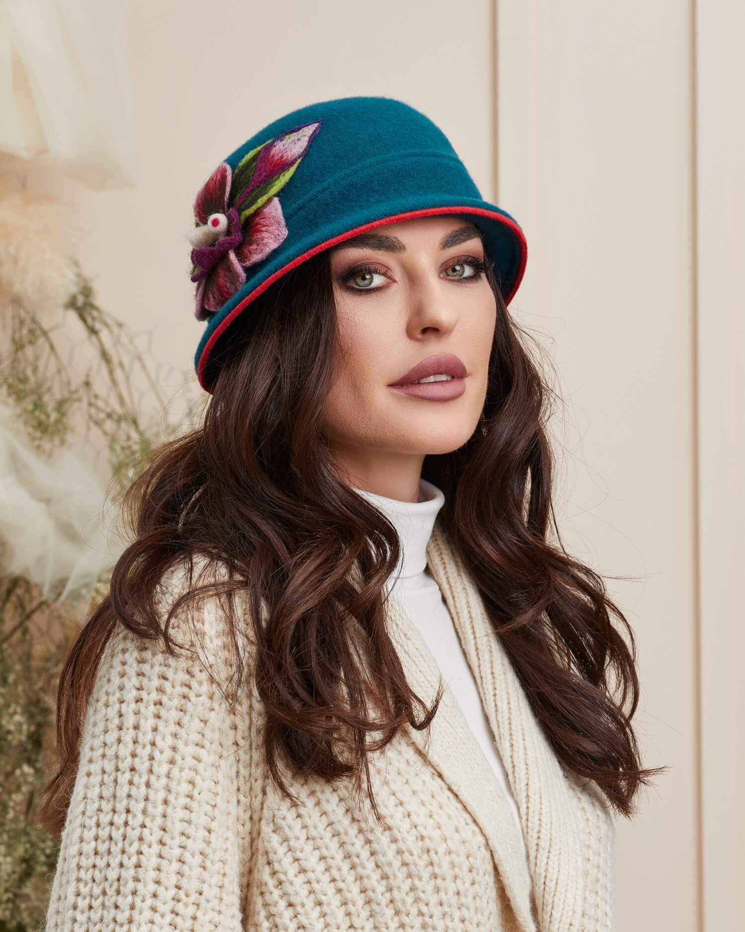 Caciula de dama stil palarie Sisi este o alegere perfecta pentru femeile care doresc sa isi puna in valoare frumusetea naturala si sa se bucure de o piesa vestimentara practica. Marginea borului cusuta in culoarea rosie atrage priviri asupra fetei. Elementele decorative aplicate manual, precum florile in nuante pastelate, completeaza designul si ii confera un aspect unic. Culorile pot fi usor diferite fata de poza, ceea ce confera un caracter special si o nota de autenticitate.