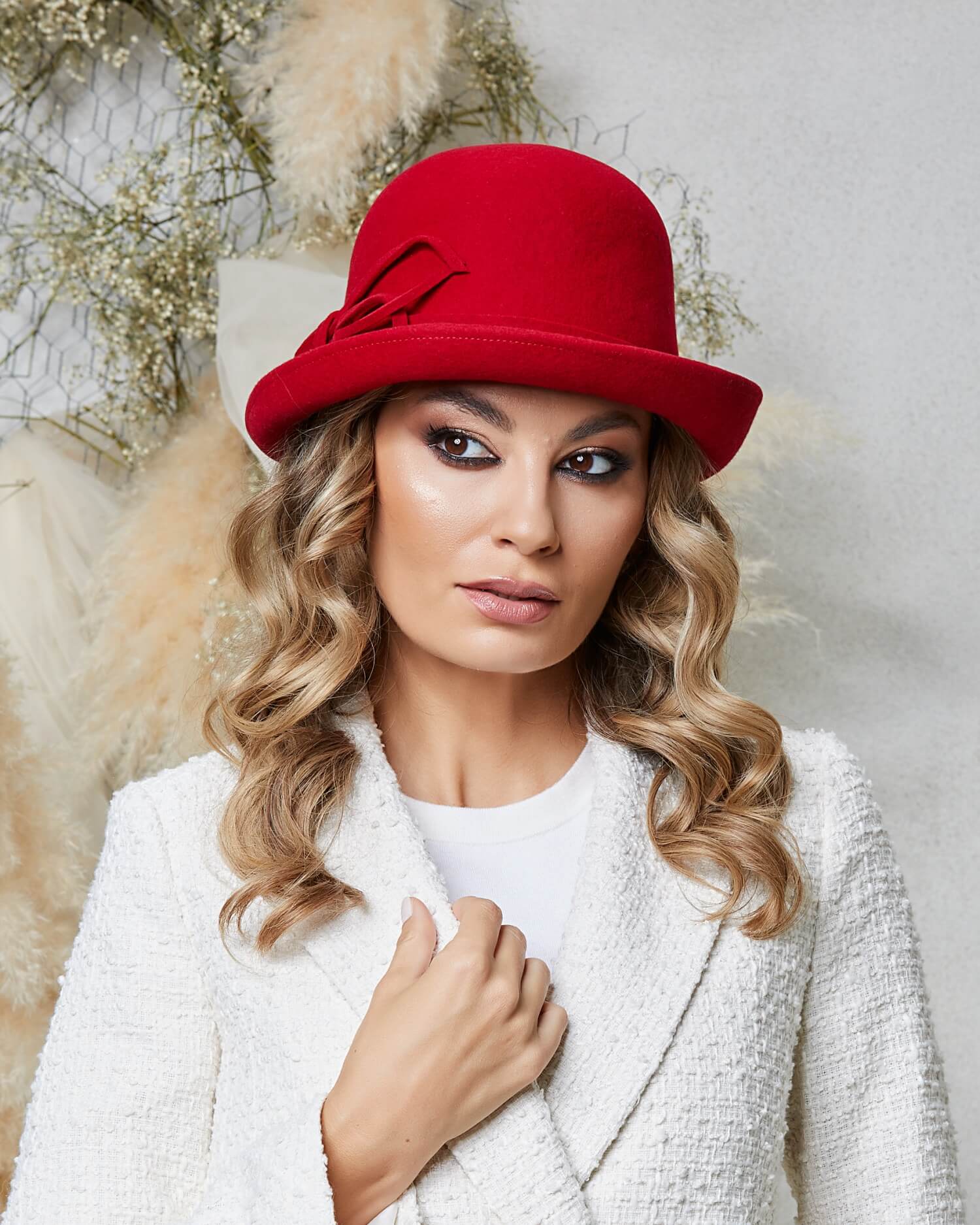 Palarie de dama Anya 8 – partea dreapta gazduieste o funda supradimensionata, realizata din benzi inguste din fetru, care imbogateste vizual intregul design. Acest element decorativ, pe langa faptul ca este o declaratie de stil in sine, echilibreaza perfect designul asimetrica a borului din acea zona. Panglica care mascheaza trecerea de la calota la bor adauga o nota de finete si continuitate designului.