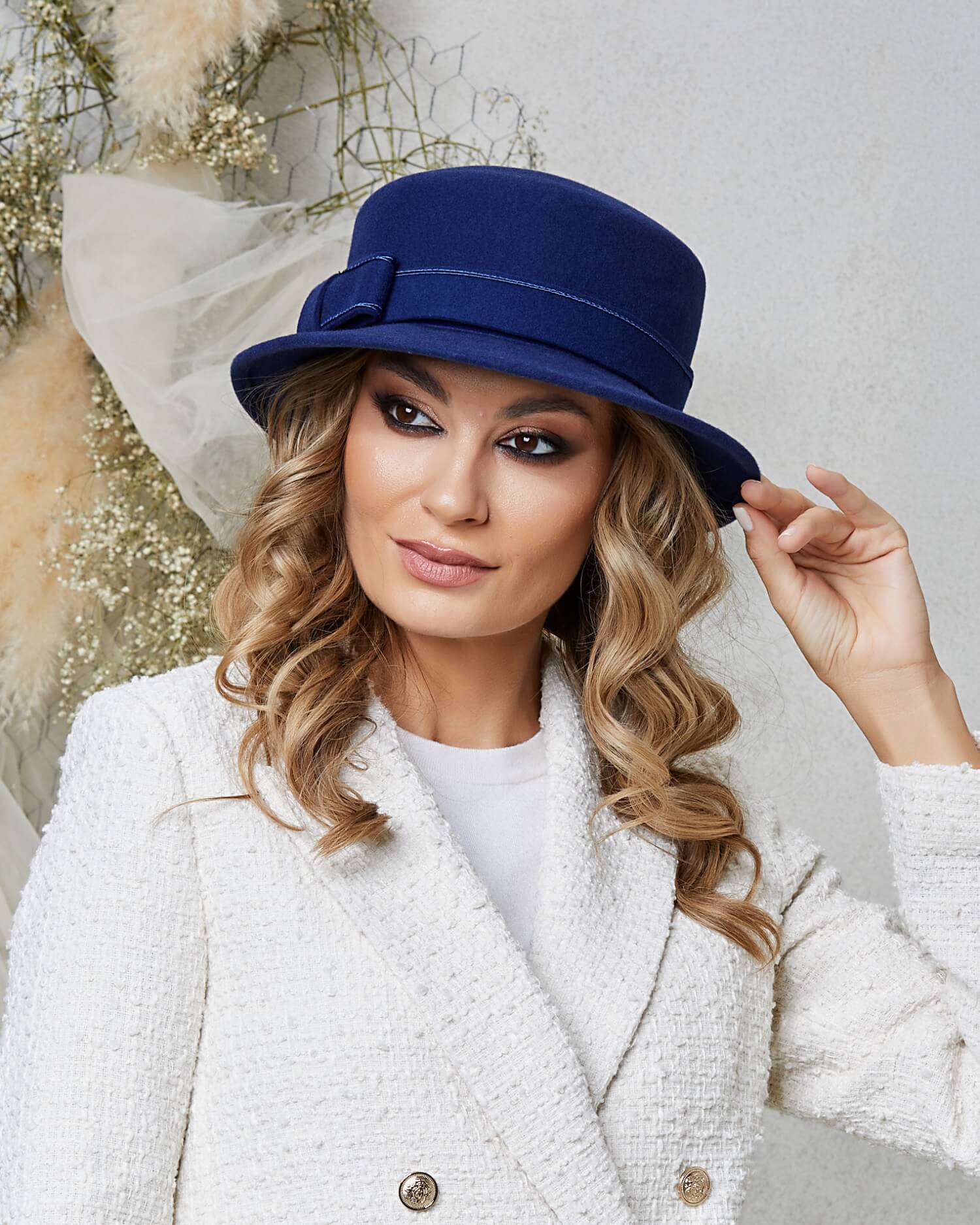 Palarie de dama Chloe 8 – culoarea albastru inchis a palariei este, de asemenea, un atu. Aceasta nuanta deosebita este usor de asortat si adauga o nota de profunzime tinutelor din sezonul rece. Fie ca este purtata la o jacheta eleganta sau la un palton clasic, palaria Chloe se va integra perfect, oferind un plus de stil si personalitate. Modelul in sine este o amintire a vremurilor in care eleganta si rafinamentul erau la ordinea zilei si dovedeste ca bunul gust sta in calitate si detalii fine.