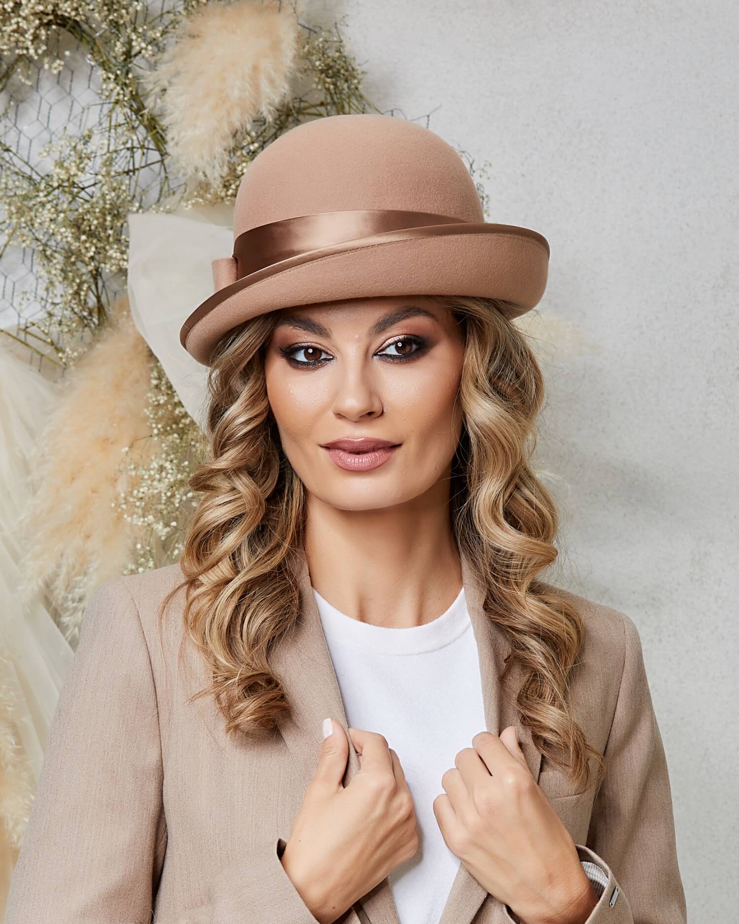 Palarie de dama Daniela 5 – incepand cu designul, calota rotunda si bombata imita perfect liniile clasice ale renumitei palarii bowler, aducand o nota de distinctie si clasa. Borul asimetric, intors cu gratie in sus, este finisat cu o panglica satinata care adauga o nuanta de stralucire subtila. Jocul de contraste intre texturile mate ale fetrului si cele lucioase ale satinului transforma aceasta palarie intr-un accesoriu sofisticat si de neuitat.