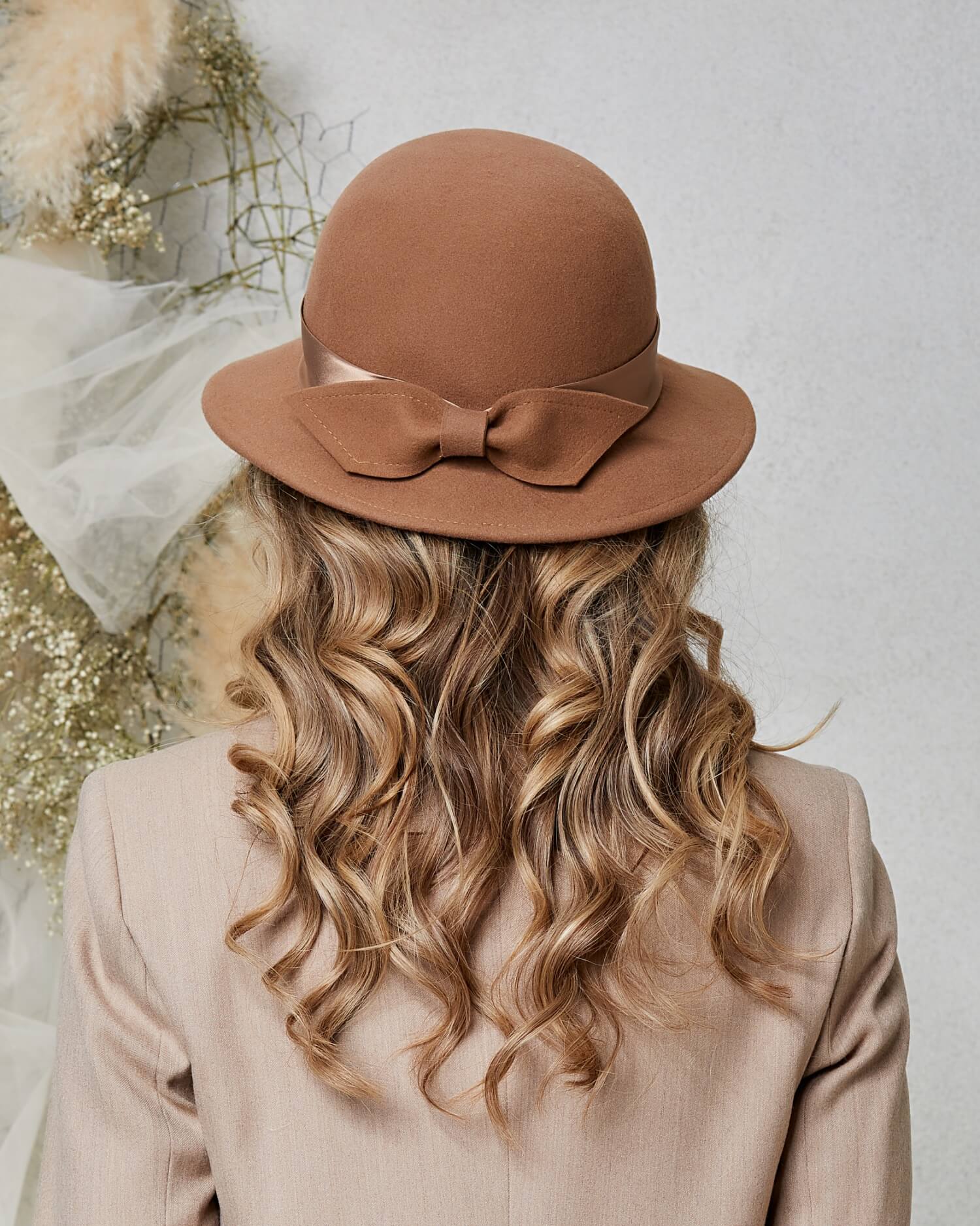 Palarie de dama Gabriela – un alt aspect demn de remarcat este faptul ca este realizata manual din fetru semi-rigid din lana. Nu doar ca ii confera o textura deosebita, dar asigura si o greutate redusa, oferindu-ti confort pe durata intregii zile. Cu o compozitie din lana, nu numai ca se va mentine in forma optima pe parcursul timpului, dar va adauga si un plus de confort datorita proprietatilor termoregulatoare. Eleganta este subliniata si prin accesorizarea cu o banda lata din satin, ce infasoara gratioasa baza calotei. Si ca detaliile sa conteze cu adevarat, in lateral, o fundita stilizata din fetru completeaza designul, adaugand un strop de feminitate si rafinament. Forma sa, cu o calota rotunda si bombata, impreuna cu borul mediu si discret aplecat in jos, defineste un contur clasic, ce aduce un omagiu frumusetii atemporale.