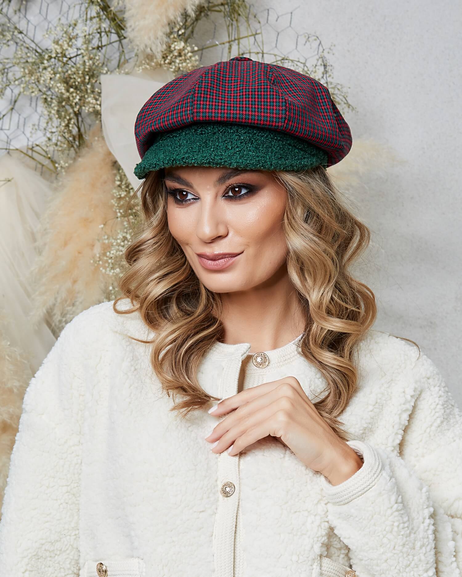 Sapca de dama Pandora se remarca prin designul sau captivant ce pune in valoare imprimeul Houndstooth in nuante vibrante de verde inchis combinat cu rosu. Acest model clasic, cunoscut si sub denumirea de „dinti de caine” sau „picioare de cocos”, isi are originea in Scotia si a devenit faimos la nivel mondial pentru clasa si stilul pe care le aduce. Marginile si cozorocul sepcii sunt finisate cu o tesatura boucle in tonuri de verde inchis, adaugand o textura suplimentara si un contrast placut.